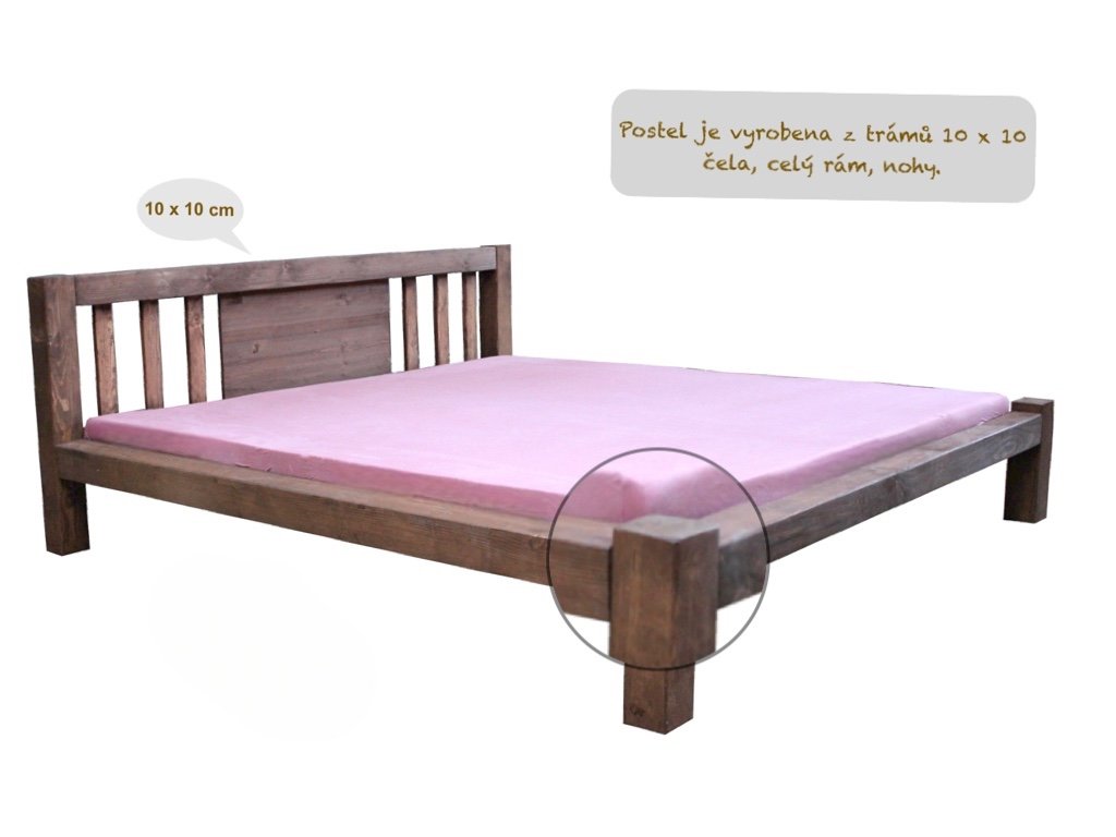 Použitý konstrukční materiál: rám i nohy z trámů 10 × 10 cm – postel, která vydrží vše.